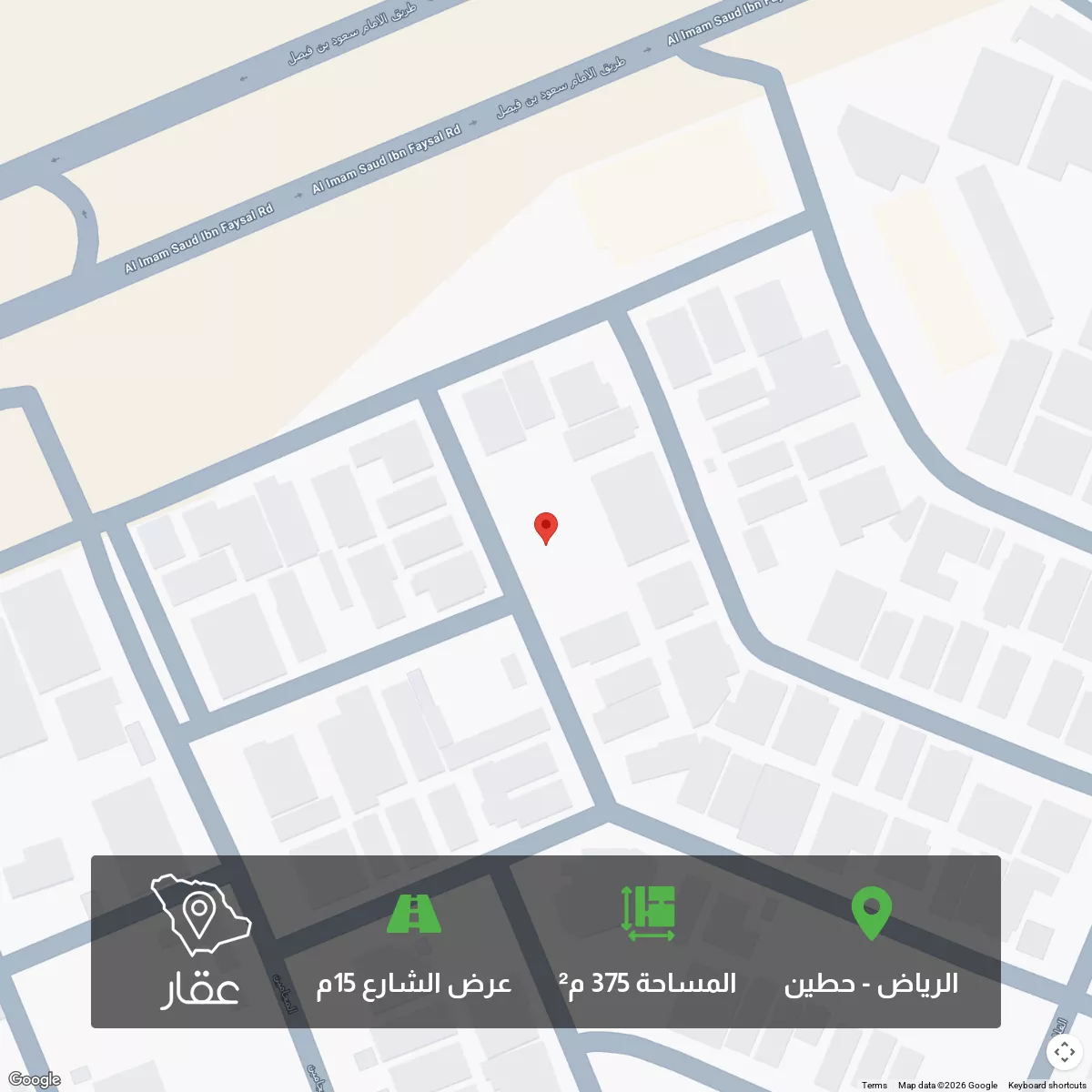 375 م² أرض في حطين، الرياض معروضة بسعر ٣٬١٥٠٬٠٠٠ ريال، أقل بنسبة 57% من متوسط سعر الحي البالغ ٧٬٢٨٢٬٨٠٠ ريال. بناءً على 45 عقار مشابه.