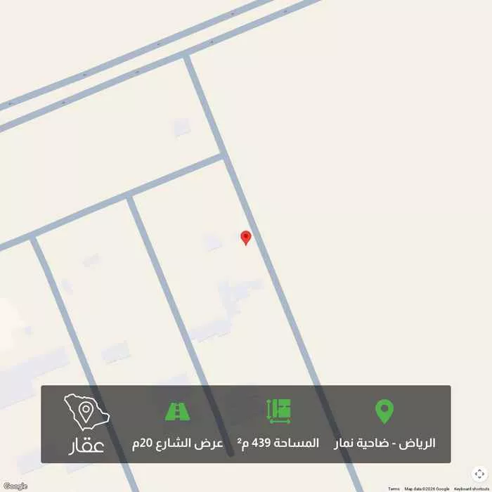 439 م² أرض في ضاحية نمار، الرياض معروضة بسعر ١٦٬٠٥٦ ريال، أقل بنسبة 98% من متوسط سعر الحي البالغ ٧٥٠٬٠٠٠ ريال. بناءً على 439 عقار مشابه.