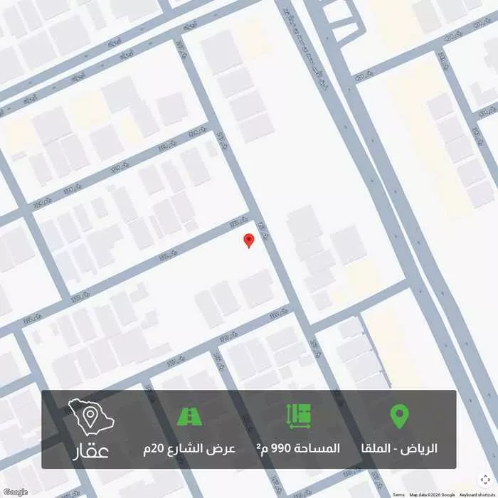 عرض على Aqarللبيع قطع ارض سكني بحي الملقا موقع مميز مساحه٩٩٠ م زاويه شارع ٢٠ شرقي شارع ٢٠ شمالي الاطوال ٣٠ في ٣٣ السوم ٩٦٠٠