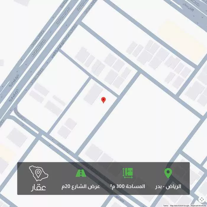 عرض على Aqarأرض للبيع في حي بدر • المساحة: 300 م² • الواجهة: جنوبية • عرض الشارع: 20 متر • رقم القطعة: 22 • رقم المخطط: 2003 • الأطوال: 12 × 25
