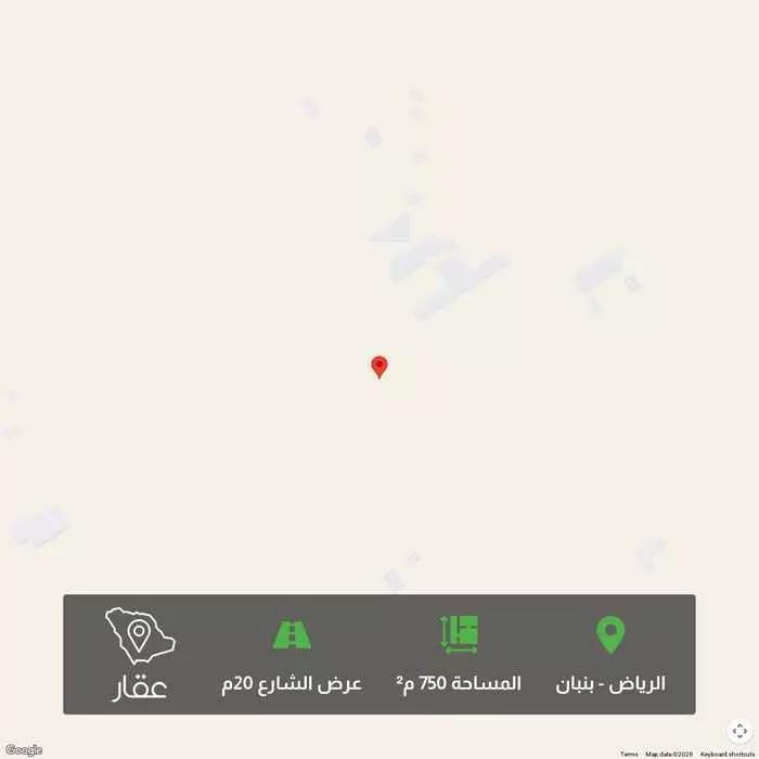 750 م² أرض في بنبان، الرياض معروضة بسعر ١٬١٢٥٬٠٠٠ ريال، أعلى بنسبة 39% من متوسط سعر الحي البالغ ٨٠٨٬٥٠٠ ريال. بناءً على 947 عقار مشابه.