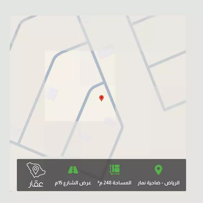 248 م² أرض في ضاحية نمار، الرياض معروضة بسعر ٤٧١٬٧٧٠ ريال، أقل بنسبة 37% من متوسط سعر الحي البالغ ٧٥٠٬٠٠٠ ريال. بناءً على 439 عقار مشابه.