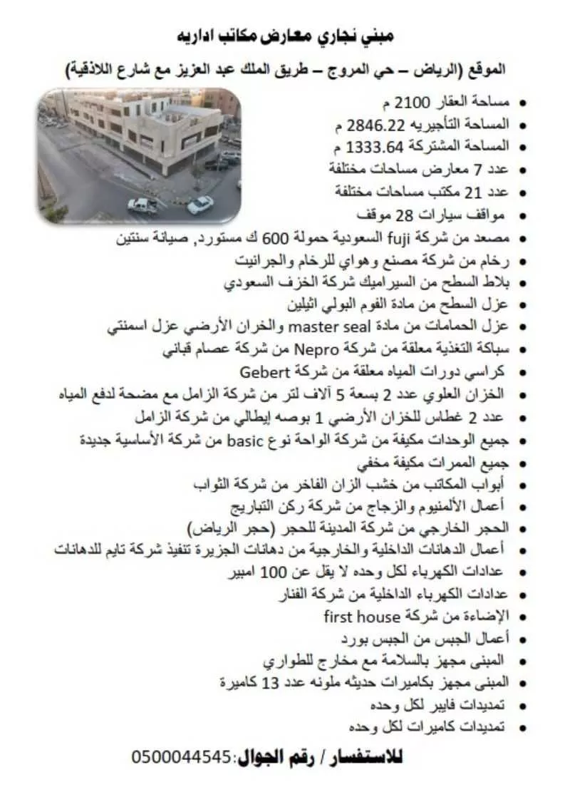 مبنى. تجاري للإيجاري. الرياض حي المروج شمال الرباض. سعر إيجار للمتر 2000ريال المساحه التأجيريه 2845. متر