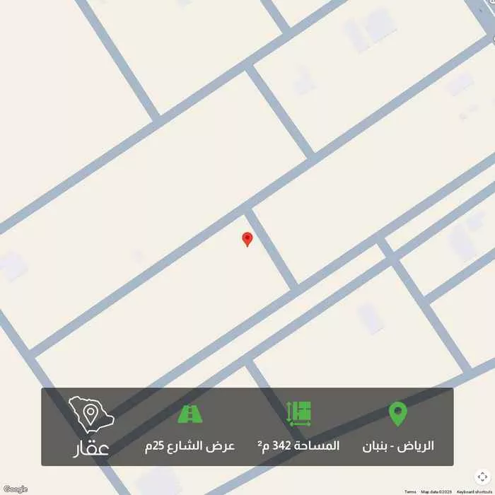 342 م² أرض في بنبان، الرياض معروضة بسعر ٣٩٣٬٣٠٠ ريال، أقل بنسبة 51% من متوسط سعر الحي البالغ ٨٠٨٬٥٠٠ ريال. بناءً على 947 عقار مشابه.