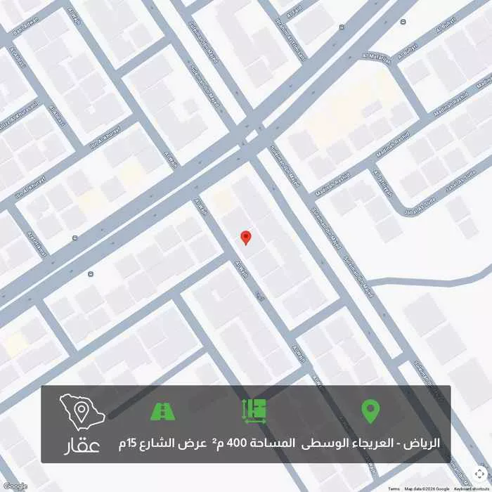 عرض على Aqarللبيع أرض مميزة في حي العريجاء المساحة: 400 م² الأطوال: 20 × 20 م الواجهة: غربيه عرض الشارع: 15 م مناسبة لبناء فلتين دبلكس. على السوم مباشر مع المالك