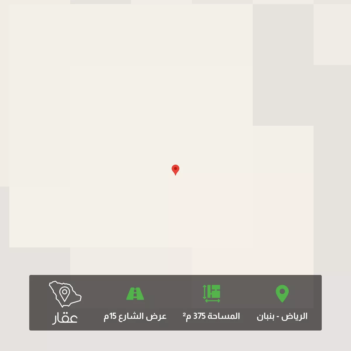 375 م² أرض في بنبان، الرياض معروضة بسعر ١٥٬٣٦٠ ريال، أقل بنسبة 98% من متوسط سعر الحي البالغ ٨٠٨٬٥٠٠ ريال. بناءً على 947 عقار مشابه.