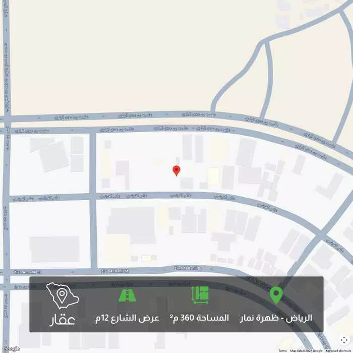 360 م² أرض في ظهرة نمار، الرياض معروضة بسعر ١٬٢٦٠٬٠٠٠ ريال، أقل بنسبة 52% من متوسط سعر الحي البالغ ٢٬٦١٧٬٨٠٠ ريال. بناءً على 30 عقار مشابه.