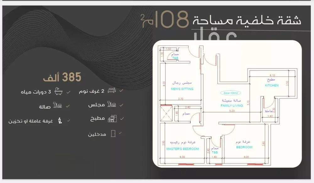 عرض على Aqar* ثلاث غرف خلفية * السعر 385,000 المساحة 108 م _____________ ______________________ * مزايا المشروع * * تمديدات سباكة حرارية ضمان 15 سنة . * خزانات مستقلة علوية - سفلية . * مراوح شفط دكت - مركزي . ...