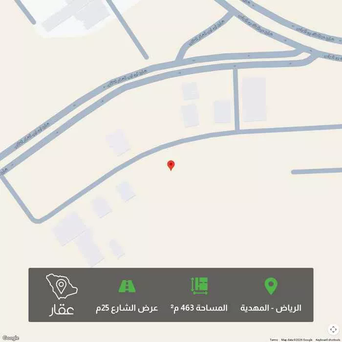 463 م² أرض في المهدية، الرياض معروضة بسعر ١٬٤٣٥٬٤٨٦ ريال، أقل بنسبة 21% من متوسط سعر الحي البالغ ١٬٨٢٠٬١٠٠ ريال. بناءً على 374 عقار مشابه.