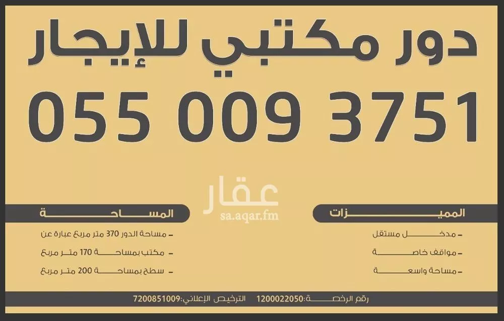 مكتب للإيجار (دور كامل) | حي القيروان مدخل خاص - سطح واسع - موقع استراتيجي الموقع: تقاطع طريق محمد بن سعد مع عبدالله بن جبرين. تفاصيل المساحة: * المساحة الإجمالية: 370م٢. * (170م٢ مسقوف + 200م٢ سطح خا...