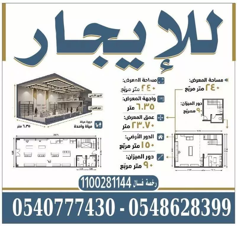 معرض تجاري على طريق الملك فهد تقاطع طريق الظهران الجبيل السريع ( الخدمه ) واجهه المعرض : 6.35 متر عمق المعرض : 23.70 متر الدور الارضي : 150 متر مربع دور الميزان : 90 متر مربع مساحة اجمالية : 240 متر م...