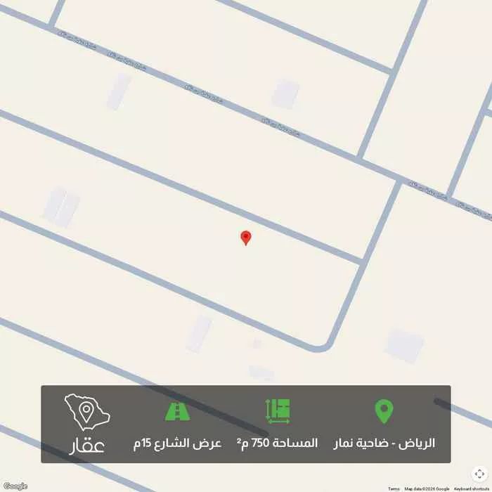 عرض تسويقي عربي أرض سكنية للبيع في حي نمار – غرب الرياض فرصة مميزة لامتلاك أرض سكنية في موقع هادئ ضمن مخطط حديث، مثالية لبناء فيلا سكنية في منطقة واعدة. المساحة: 750 م² الأبعاد: 25 × 30 الشارع: 15م شم...