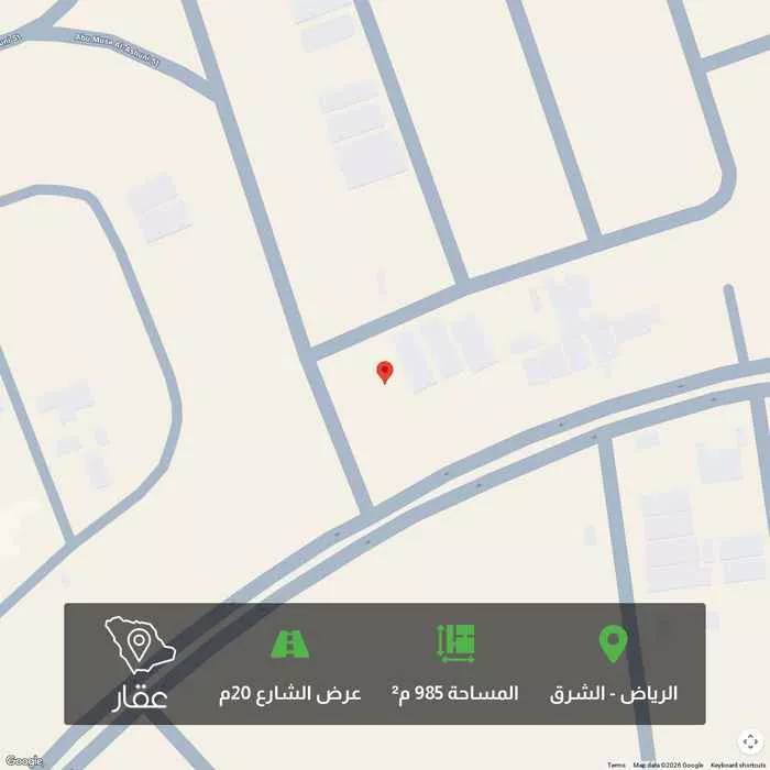 985 م² أرض في الشرق، الرياض معروضة بسعر ٣٬٩٤٢٬٠٠٠ ريال، أعلى بنسبة 558% من متوسط سعر الحي البالغ ٥٩٨٬٩٥٠ ريال. بناءً على 650 عقار مشابه.