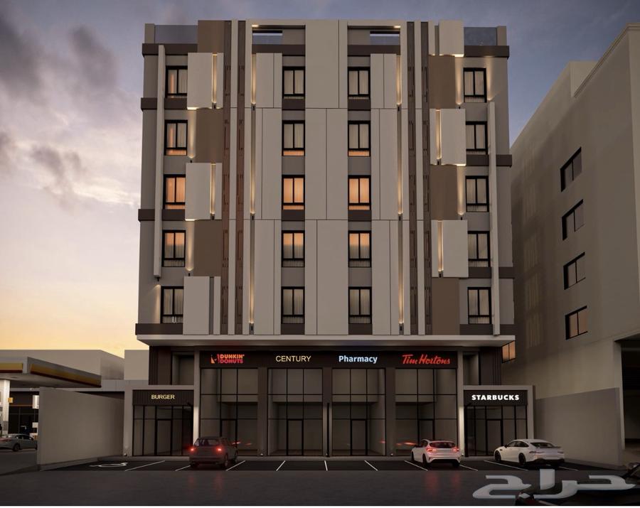 Ownership apartments for sale in Al-Safa neighborhood (Umm Al-Qura Street) consisting of 4 rooms, 5 rooms, a hall, three bathrooms, and a kitchen on two streets, a balcony, opposite a mosque, a garden...