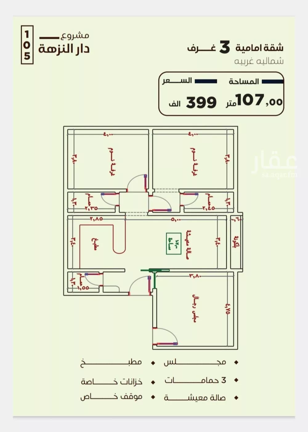 ثلاث غرف امامية السعر 399,000 المساحة 107 م _____________ ________________ *مميزات موقع المشروع* * بالقرب من العرب مول * بالقرب من مطار الملك * بالقرب من طريق المدينة * بالقرب من طريق الستين * بالقرب ...