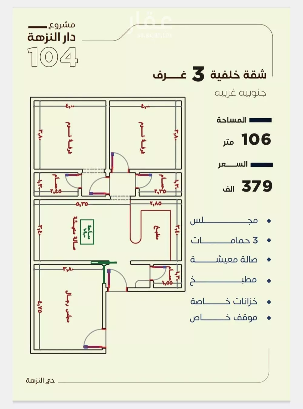 ثلاث غرف جنوبية غربية السعر 380,000 المساحة 106 ____________ ____________________ *مميزات موقع المشروع* * بالقرب من العرب مول * بالقرب من مطار الملك * بالقرب من طريق المدينة * بالقرب من طريق الستين * ...