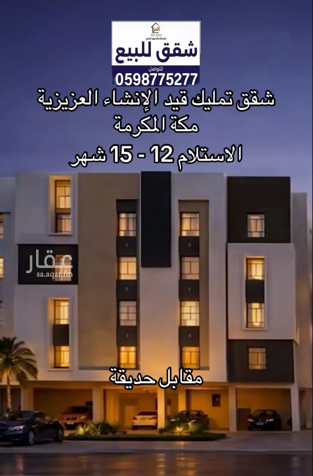 شقق تمليك قيد الإنشاء ممتازة في العزيزية قلب مكة للاستثمار والتأجير والسكن شقق نادرة في منطقة العزيزية وعليها طلب في موقع مميز جدا في العزيزية قلب مكة مقابل جامع مقابل حديقة تمام على شارعين مواقف تردد...
