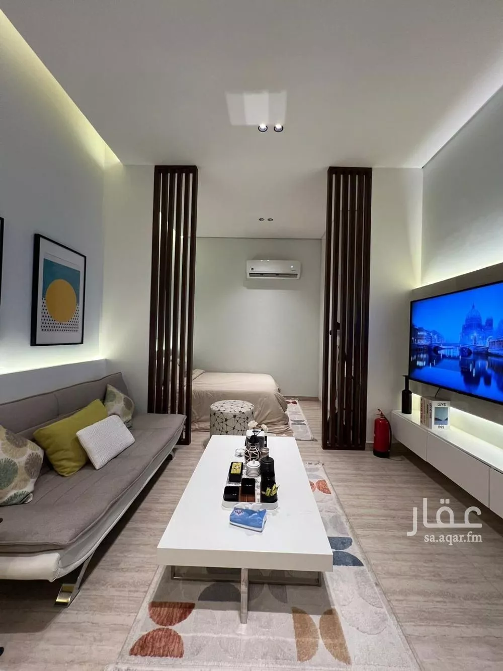 - ستديو مودرن بأثاث رائع ومميز جداً ويحتوي على 1 - (قسم للنوم) سرير وإضاءة معلقة وكوميدينو ومراية كبيرة و تسريحة مع كرسي ومراية و دولاب بمساحة تخزين حتى السقف 2 - (قسم للجلسة) كنبة يمكن تحويلها لسرير ...