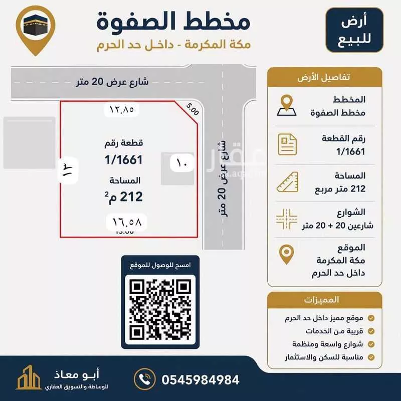 أرض زاوية للبيع داخل حد الحرم – مخطط الصفوة – شارعين 20 + 20 – مكة – مخطط الصفوة (داخل حد الحرم) رقم القطعة: 1661 المساحة: 212 متر مربع على شارعين 20 + 20 واجهة مميزة (زاوية) أطوال الأضلاع: 13 متر 13....