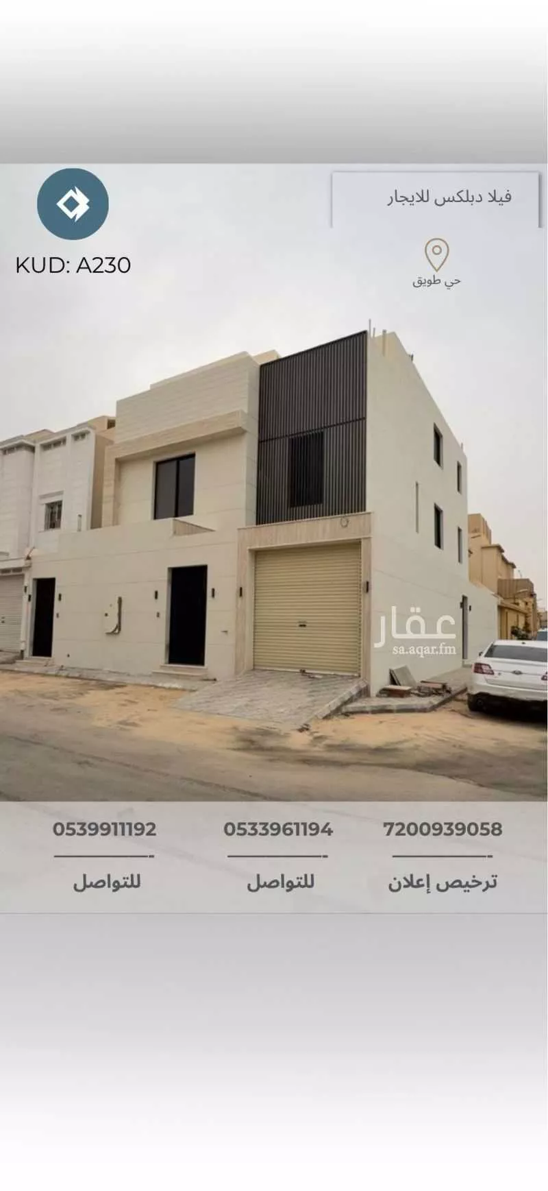 KUD:A230 دبلكس للايجار درج داخلي + مدخل سيارة المواصفات : مساحة 250م شارعين 15 شرقي شمالي الارضي : ضيافة مجلس رجال ومقلط ومجلس نساء ومطبخ و2 دورة مياه الاول : 4 غرف نوم 2 منهم ماستر 1 رئيسية والثانيه ...