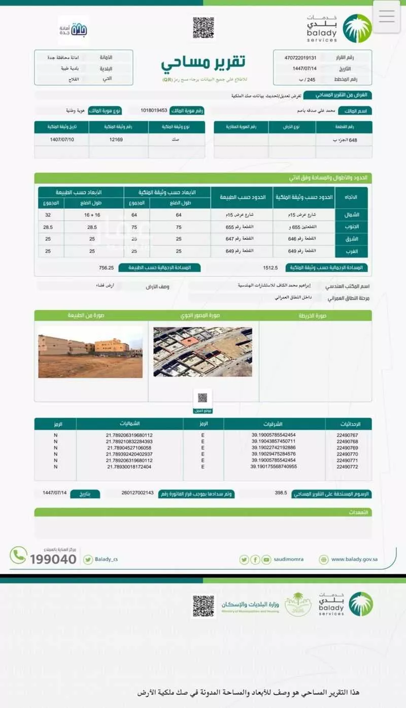 من المالك مباشرة ارضين بصك واحد تقع في جدة حي الفلاح مخطط 245 ب ضلع الواجهة 63م أرقام القطع 647 /648 المساحة الإجمالية 1493.م من الإقرار المساحي. 1512 م السعر 2.850.000 للقطعتين للإستفسار وتس اب