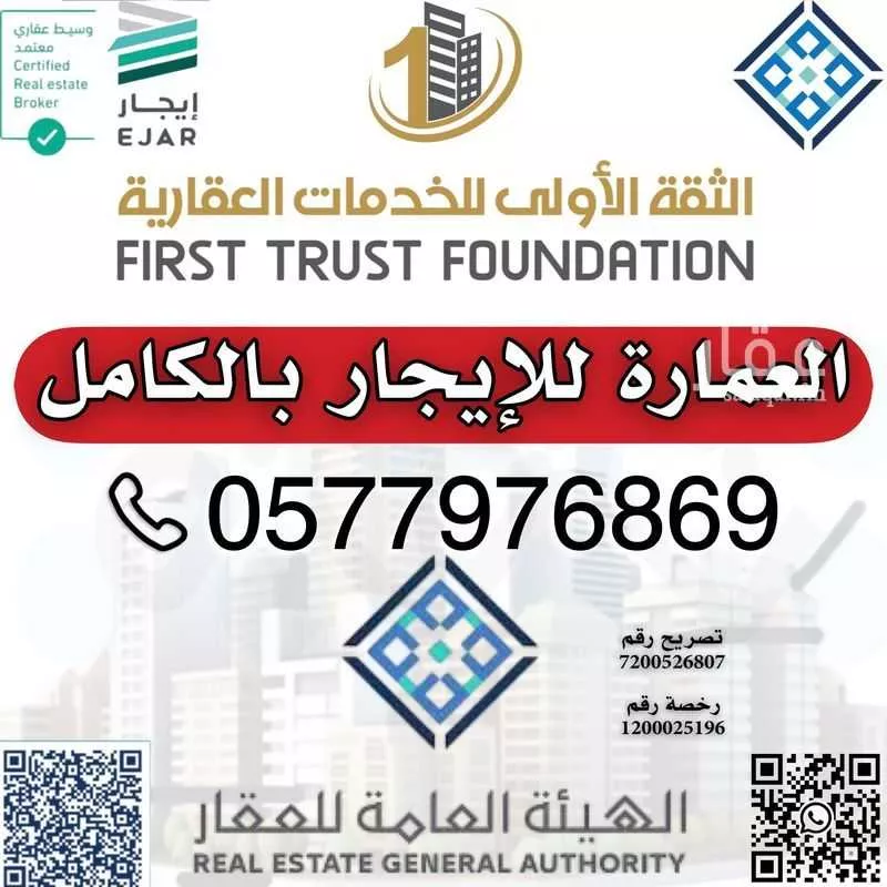 تعلن الثقة الأولى العقارية عن توفر عمارة للايجار بالكامل حي المنار شارع 52 م - مساحة 910 م دورين وملحق - عدد 1 مصعد غرف 30 - مطابخ 26 دورات مياه 29 - صاله 12 شمالاً قطعة رقم 1 بطول 26م جنوباً شارع عرض...