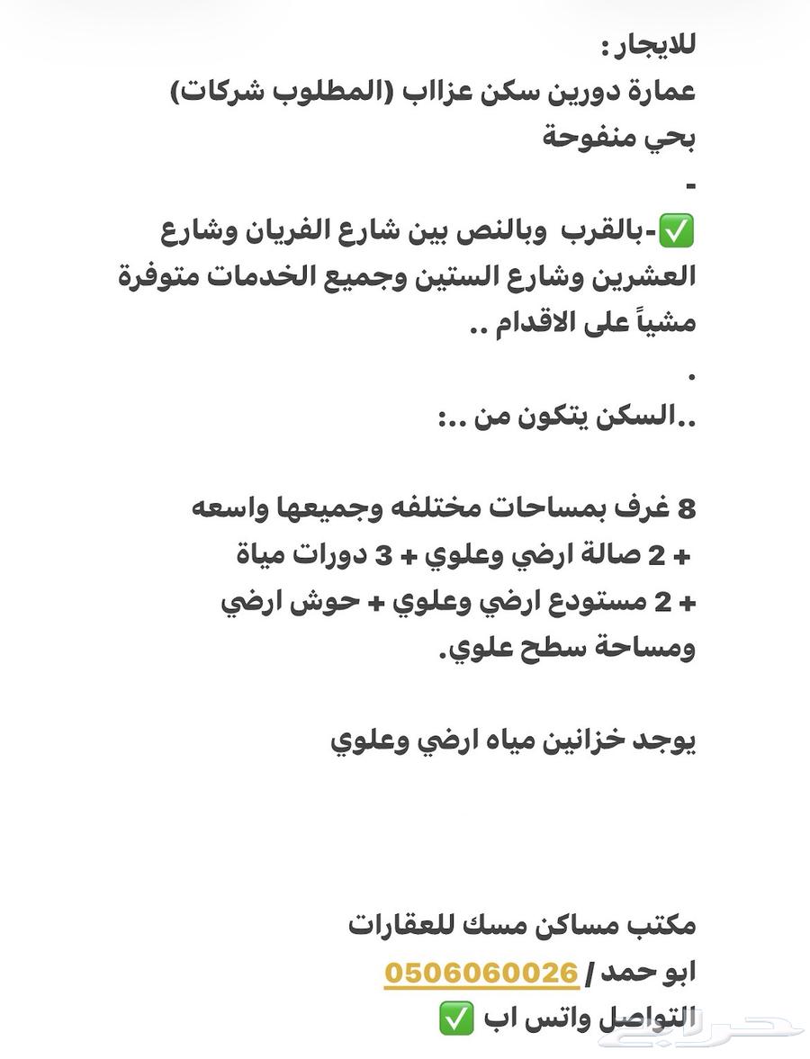 معلومات العقار حسب الرخصة غرض الإعلان: إيجار سعر الوحدة: 55000 نوع العقار: عمارة عمر العقار: اكثر من عشر سنوات مساحة العقار: 166.82 واجهة العقار: شرقية عدد الغرف: 8 رقم المخطط: لا يوجد رقم القطعة: بدو...