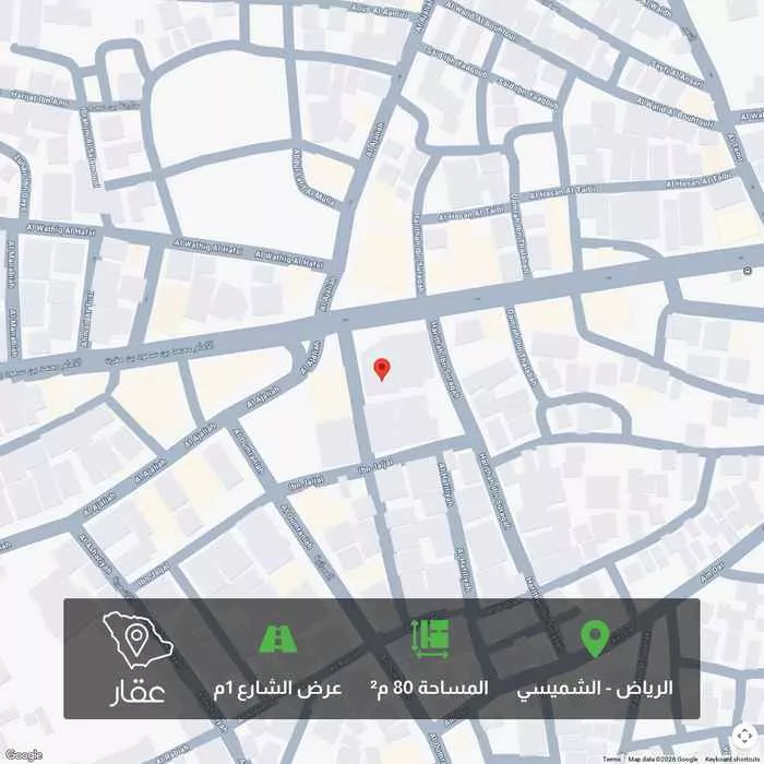 80 م² أرض في الشميسي، الرياض معروضة بسعر ١٢٠٬٠٠٠ ريال، أقل بنسبة 58% من متوسط سعر الحي البالغ ٢٨٨٬٧٥٠ ريال. بناءً على 13 عقار مشابه.