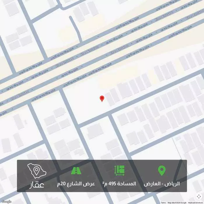 - ارض للبيع سكنية - في حي العارض - مخطط 2078/أب - قطعة 2011 - المساحة 495 متر - الأطوال 15*33 - جنوبية - شارع 20 - طبيعة ممتازة - قريبة من طريق ابي بكر الصديق