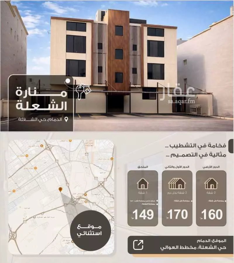 يتكون المبنى من 7 شقق موزعة كالتالي: الدور الأرضي – 2 شقة • مساحة كل شقة: 160 م² تتكون من 3 غرف نوم واحدة منهم ماستر و صالة و مجلس و مقلط و مطبخ و 4 دوارت مياه السعر : 650,000 ريال …. كما تتوفر في نفس...