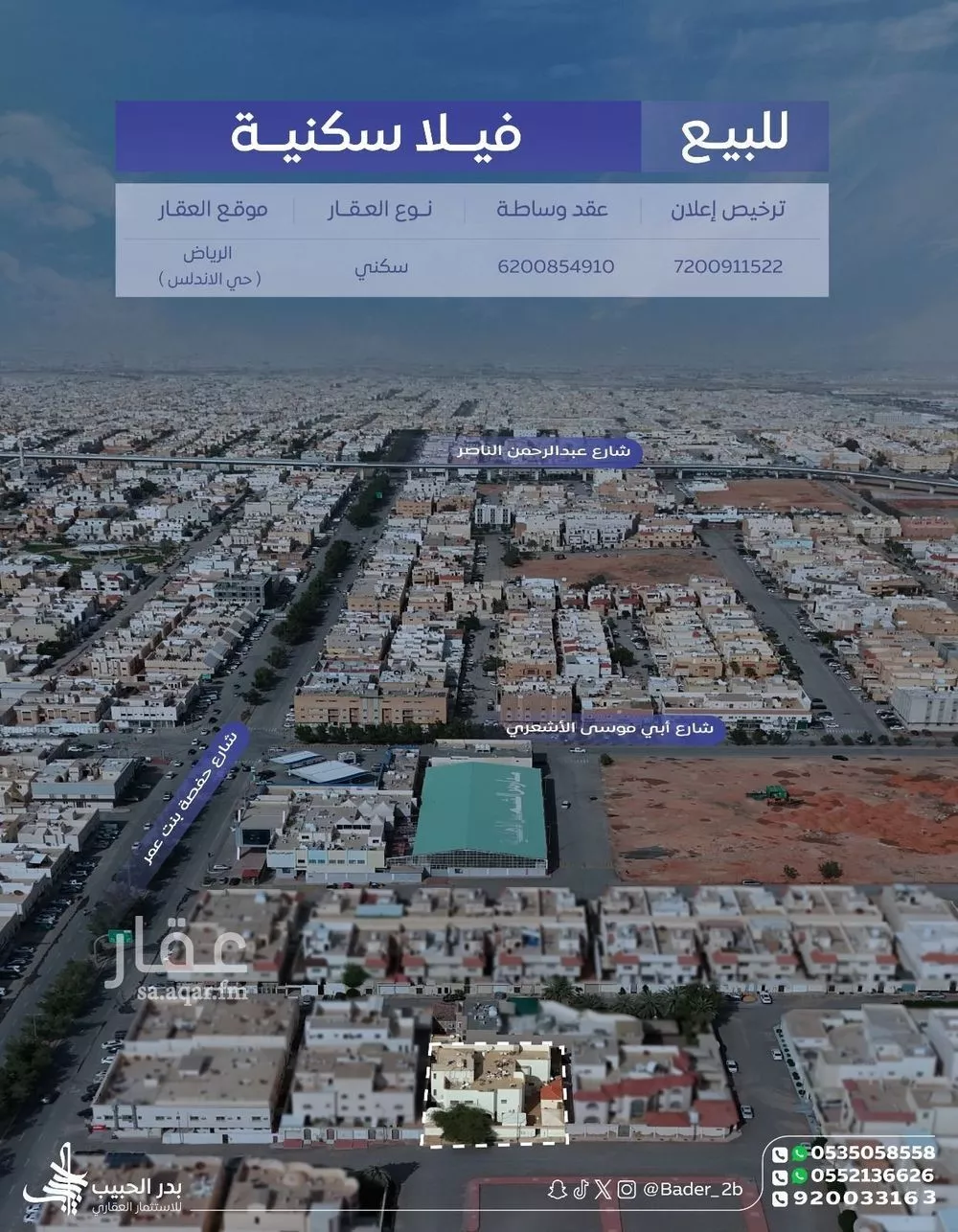 للبيع فيلا سكنية الموقع : الرياض ( حي الاندلس ) المساحة : 625 م² الواجهة : شارع عرض 15 م غربا الفيلا تتكون من : الدور الأرضي : مجلس + مقلط + 4 غرف+ صالة + مطبخ +2 مدخل سيارة + 4 دورات مياه + ملحق خارج...