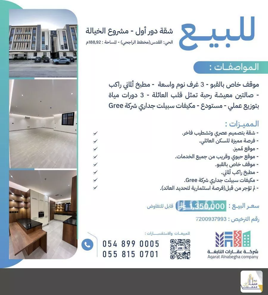 للبيع شقة دور أول – مشروع الخيالة حي القدس | مخطط الراجحي المساحة: 188.92 م² شقة بتصميم عصري وتشطيب فاخر، توفر راحة ومساحات عملية: - 3 غرف نوم واسعة - مطبخ ألماني راكب - صالتين معيشة رحبة - 3 دورات مي...