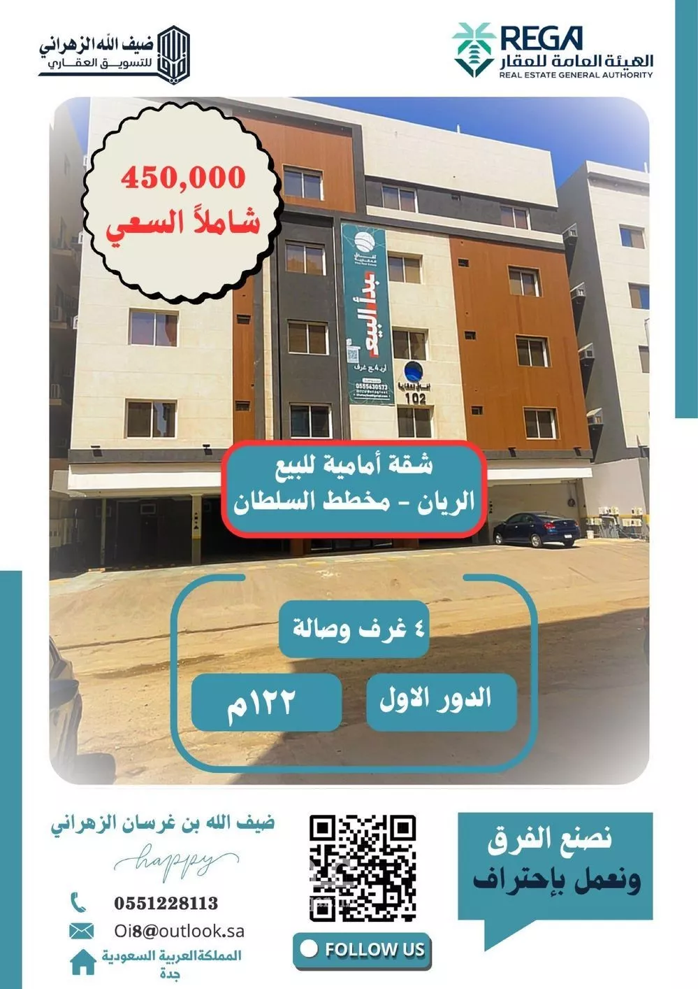 4 غرف شقة في الريان، جدة معروضة بسعر ٤٥٠٬٠٠٠ ريال، أقل بنسبة 2% من متوسط سعر الحي البالغ ٤٦٠٬٠٠٠ ريال. بناءً على 352 عقار مشابه.