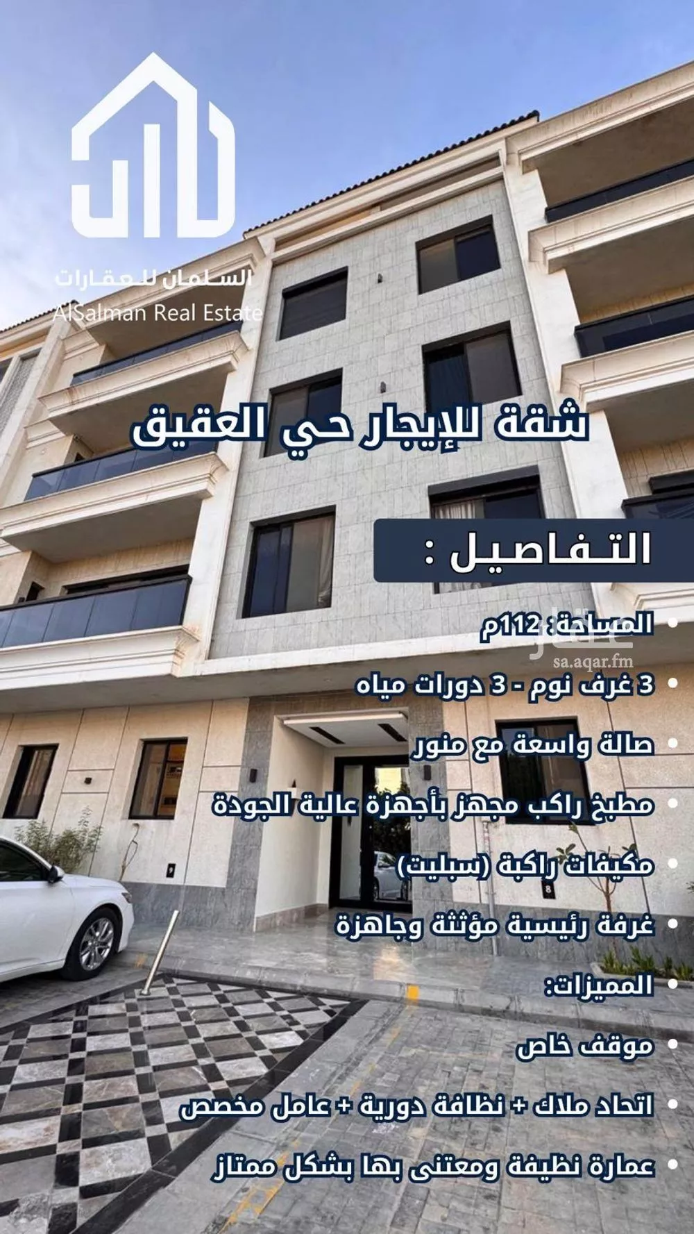 *شقة للإيجار | حي العقيق – الرياض* المساحة: 112م تتكون من: 3 غرف نوم 3 دورات مياه صالة واسعة مع منور مطبخ راكب مجهز بأجهزة عالية الجودة مكيفات راكبة (سبليت) غرفة رئيسية مؤثثة وجاهزة المميزات: موقف خاص...