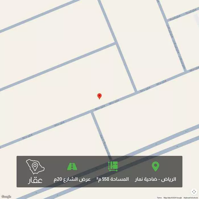 558 م² أرض في ضاحية نمار، الرياض معروضة بسعر ٥٩٩٬٢٩٢ ريال، أقل بنسبة 20% من متوسط سعر الحي البالغ ٧٥٠٬٠٠٠ ريال. بناءً على 447 عقار مشابه.