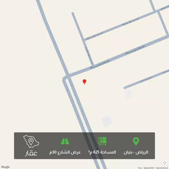 625 م² أرض في بنبان، الرياض معروضة بسعر ١٬٦٠٠٬٠٠٠ ريال، أعلى بنسبة 108% من متوسط سعر الحي البالغ ٧٦٨٬٠٠٠ ريال. بناءً على 943 عقار مشابه.