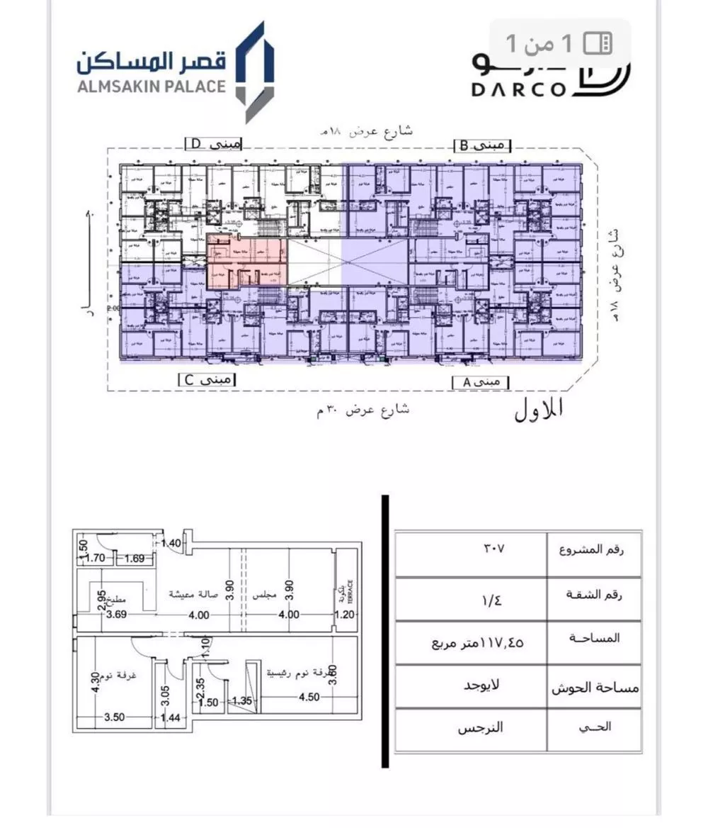 النرجس للبيع شقه في الدور الاول قسمD7 ضمن رقم مشاريع 307شركة Darco مكونه من: غرفتين نوم (وحده ماستر) صاله مع شرفه خارجيه مطله ع البهو 3 دورات مياه مطبخ مكتمل بالاجهزة الكهربائيه مكيفات مساحه الشقه 117...
