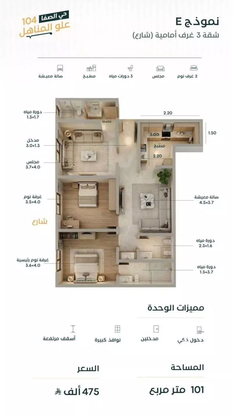 مشروع مناهل الصفا 104 آخر شقة في المشروع شقة 3 غرف امامية المساحة: 102 م² المميزات: ▪ مدخلين للشقة ▪ تشطيب مودرن فاخر ▪ تصميم عملي ومساحات مريحة ▪ غرفة سائق بدورة مياه خاصة ▪ أمام مسجد وحديقة ▪ قريبة ...