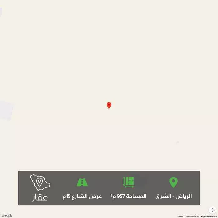 957 م² أرض في الشرق، الرياض معروضة بسعر ٤٥٠٬٠٠٠ ريال، أقل بنسبة 25% من متوسط سعر الحي البالغ ٥٩٨٬٩٥٠ ريال. بناءً على 650 عقار مشابه.