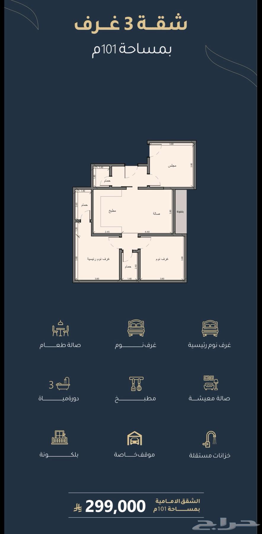 معلومات العقار حسب الرخصة غرض الإعلان: بيع سعر الوحدة: 299000 نوع العقار: شقة عمر العقار: جديد مساحة العقار: 660 واجهة العقار: شرقية عدد الغرف: 3 رقم المخطط: 377 / ج / س رقم القطعة: 732 / أ عرض الشارع...