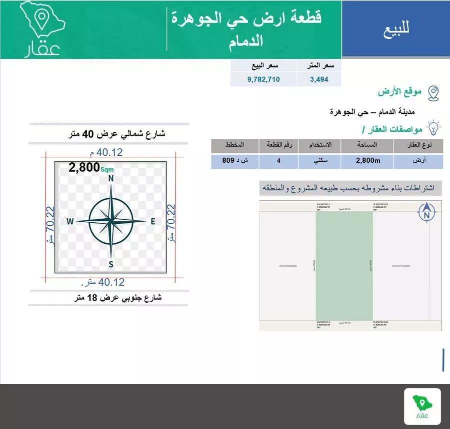 ارض سكنية على شارعين وبالامكان تحويلها الى تجاري على حسب النشاط والبناء والاشتراطات شارع شمالي بعرض 40 متر بطول 40.12 م وعمق 70.22 شارع جنوبي بعرض 18م