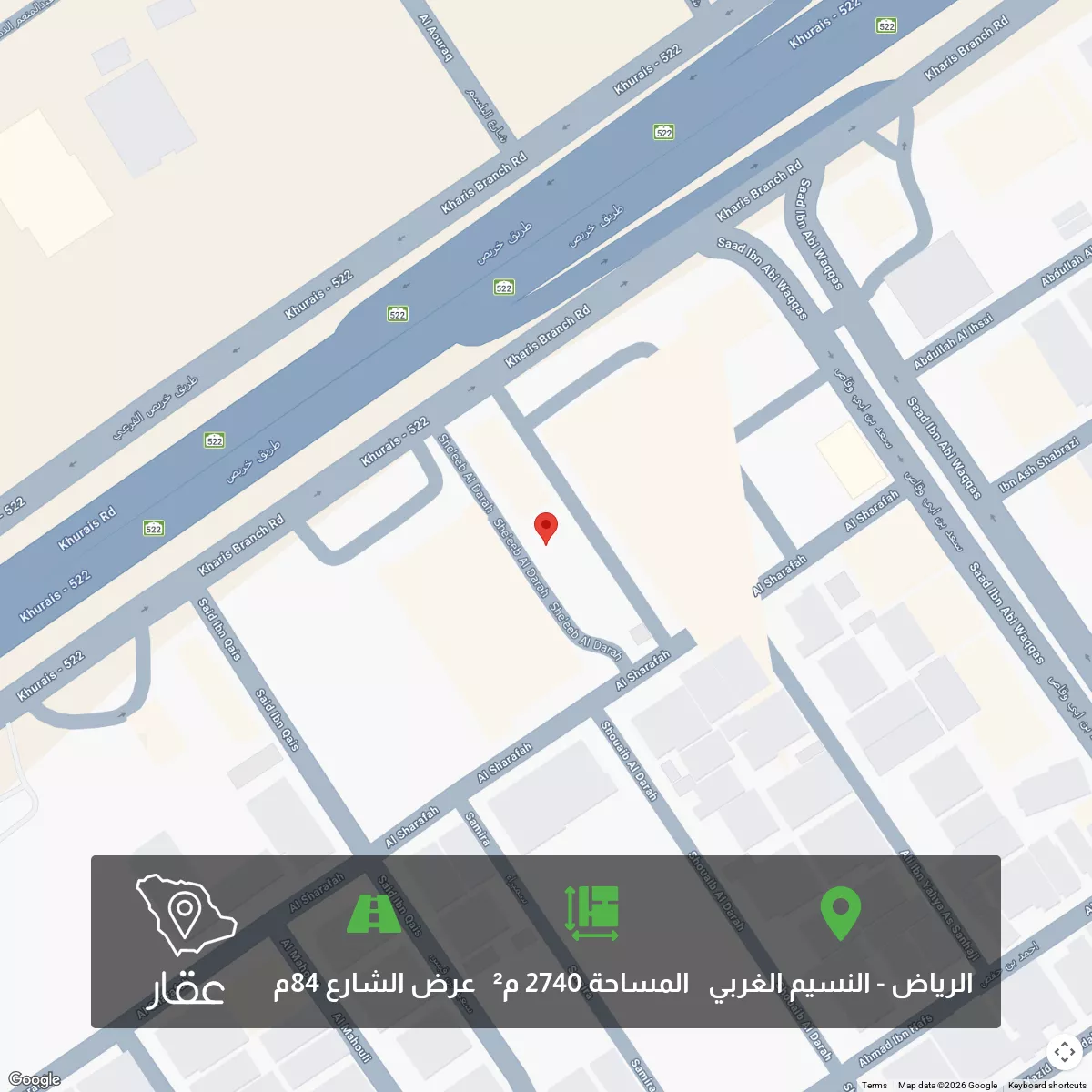 ارض تجارية على شارعين شمالا: طريق خريص عرض 84 متر بطول 27.4م وعمق 100 متر جنوبا شارع عرض 15 متر بطول 27.4متر الجزء على خريص قائم عليه مبنى درايف ثرو لأحد البراندات الشهيرة الجزء الخلفي مواقف سيارات ال...