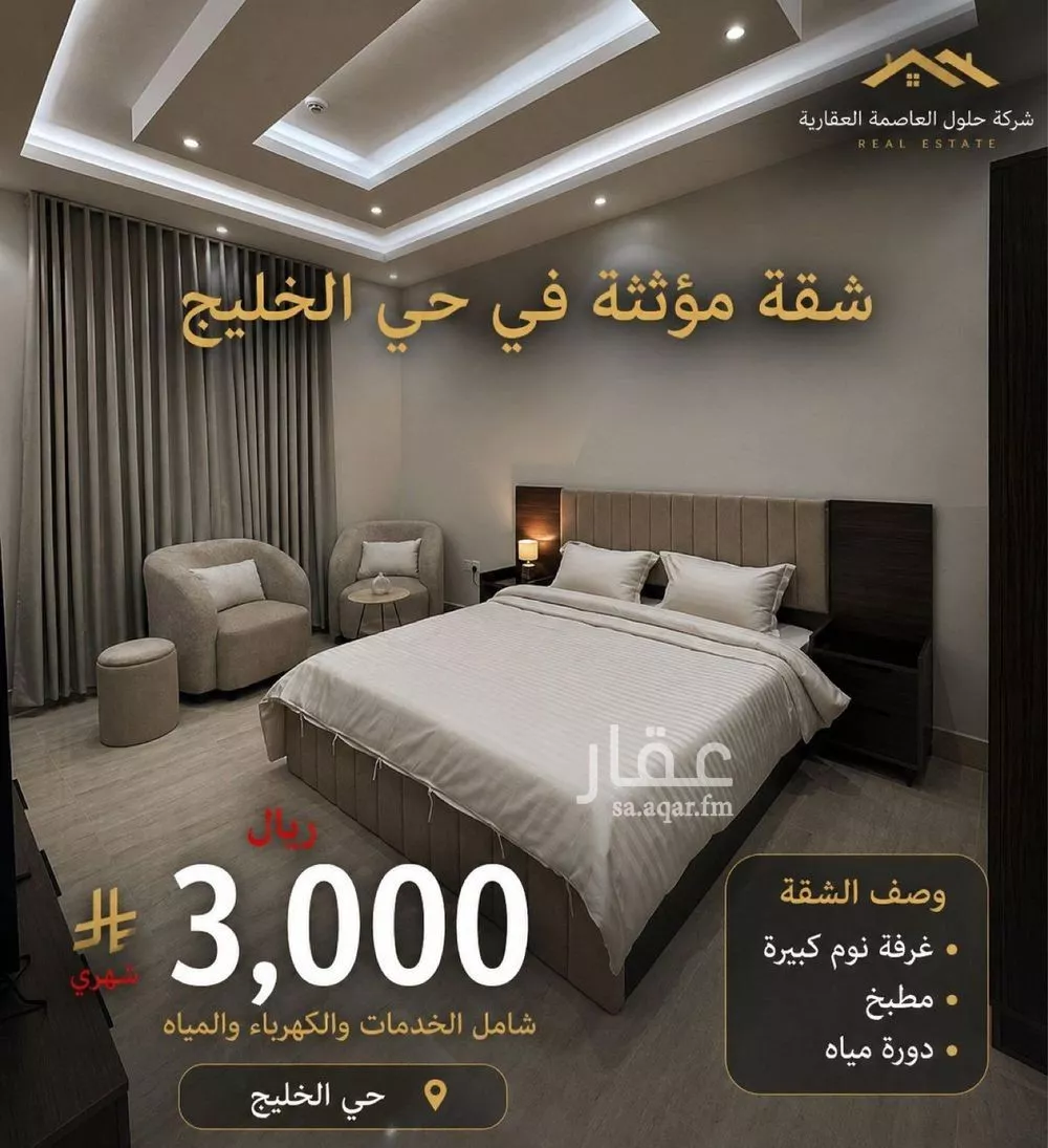 شقة بحي الخليج مكوّنه من : غرفة نوم واسعه جلسه مطبخ دورة مياه ( غسالة) موقعها قريب من جميع الخدمات