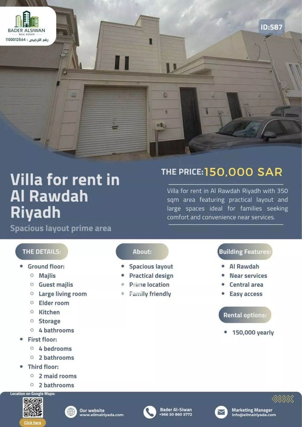 فيلا فاخرة للإيجار في حي الروضة – الرياض فرصة مميزة للسكن الراقي في موقع حيوي شمال الرياض فيلا بمساحات واسعة وتصميم عملي تناسب العائلات الباحثة عن الراحة والخصوصية. الموقع: حي الروضة – الرياض السعر: 1...