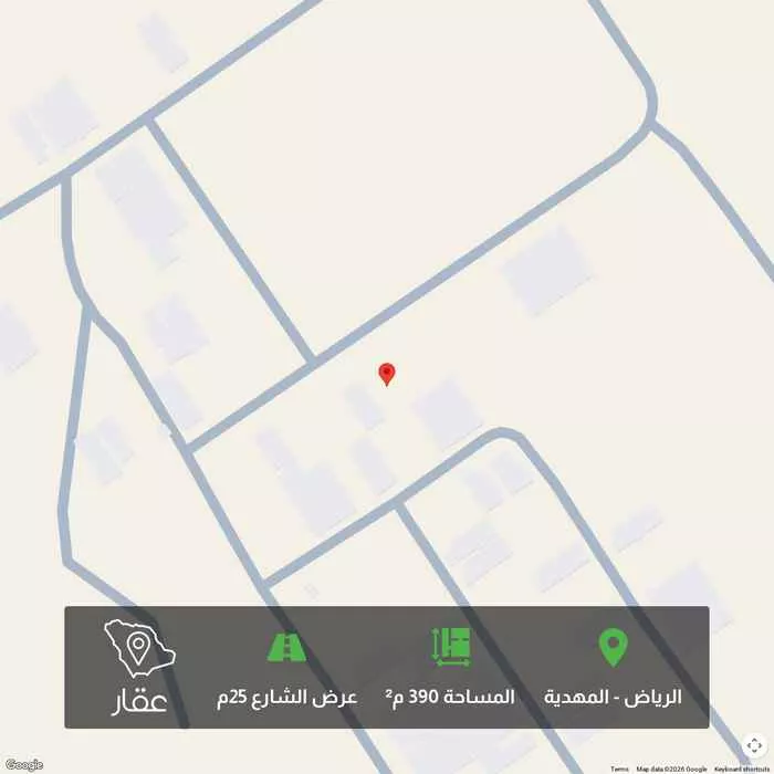 390 م² أرض في المهدية، الرياض معروضة بسعر ١٬٥٠٠٬٣٣٠ ريال، أقل بنسبة 18% من متوسط سعر الحي البالغ ١٬٨٣٩٬٨٤٠ ريال. بناءً على 364 عقار مشابه.