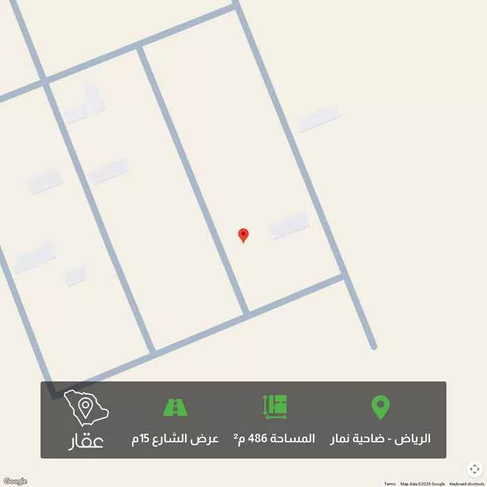 486 م² أرض في ضاحية نمار، الرياض معروضة بسعر ٦٠٠٬٣٤١ ريال، أقل بنسبة 20% من متوسط سعر الحي البالغ ٧٥٠٬٠٠٠ ريال. بناءً على 439 عقار مشابه.