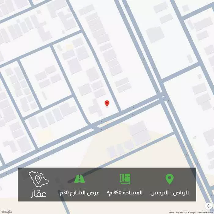 850 م² أرض في النرجس، الرياض معروضة بسعر ٨٬٥٠٠٬٠٠٠ ريال، أعلى بنسبة 191% من متوسط سعر الحي البالغ ٢٬٩٢٥٬٠٠٠ ريال. بناءً على 396 عقار مشابه.