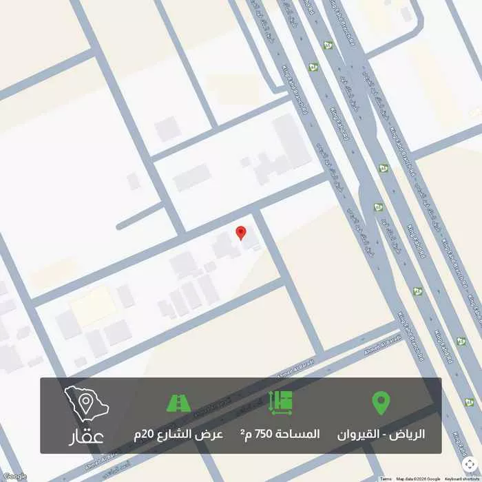 عرض على Aqarللبـــــــيـــــــع : ارض سكنية بحي القيروان بالرياض المساحة : 750 م شمالي شارع 20 بطول 30م و شرقي شارع 15 بطول 25م - مسوره بالكامل ويتوفر بئر ماء وعداد كهرباء والصرف واصل ويتوفر ايضا استراحه صغيره بم...