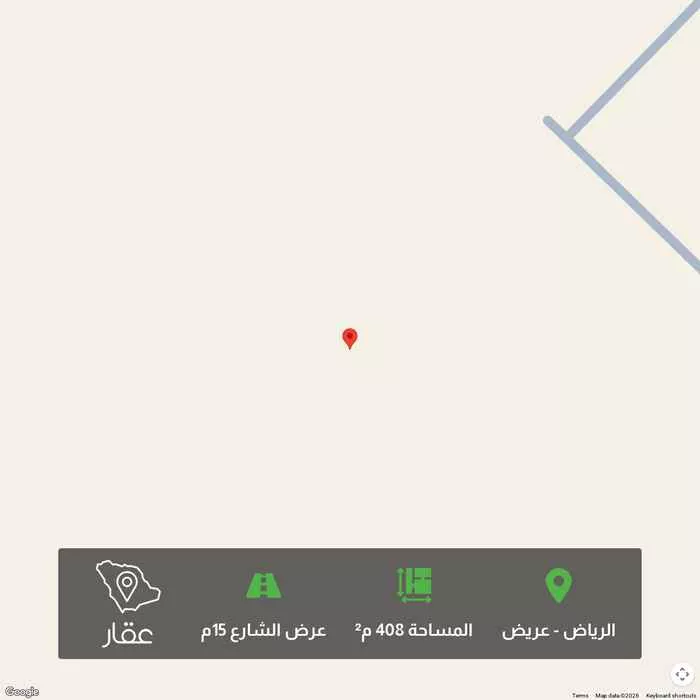 408 م² أرض في عريض، الرياض معروضة بسعر ٦٠٠٬٠٠٠ ريال، أعلى بنسبة 50% من متوسط سعر الحي البالغ ٣٩٩٬٦٠٠ ريال. بناءً على 653 عقار مشابه.