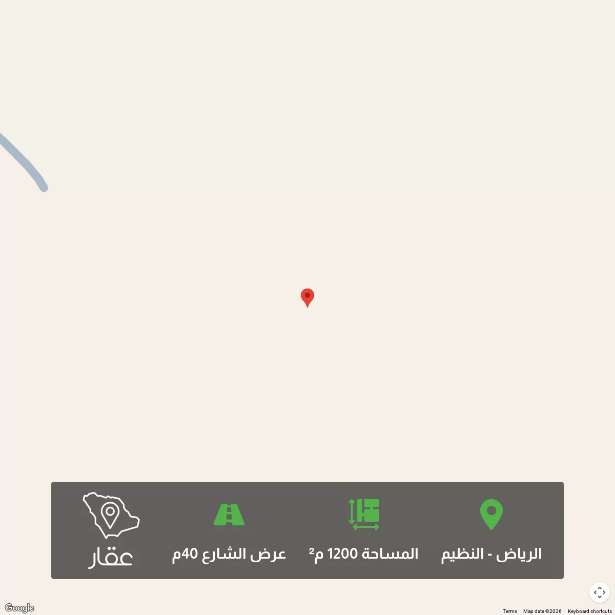 1200 م² أرض في النظيم، الرياض معروضة بسعر ٢٬٤٠٠٬٠٠٠ ريال، أعلى بنسبة 219% من متوسط سعر الحي البالغ ٧٥٣٬٠٠٠ ريال. بناءً على 228 عقار مشابه.